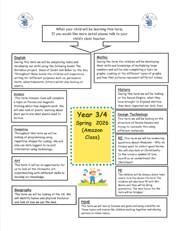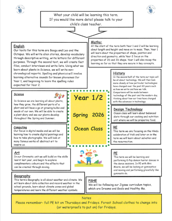 Each half term or termly in some instances, we send home a Parent Curriculum leaflet that shows which elements of the curriculum are being taught that half term through individual subjects or through a topic based curriculum.